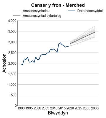 Er bod data ar achosion canser ar gael hyd at 2021, fe ddefnyddion ni 2019 fel man cychwyn yr amcanestyniadau. Effeithiwyd ar ddata canser o 2020 a 2021 gan bandemig COVID-19, sy'n eu gwneud yn llai defnyddiol ar gyfer nodi tueddiadau hirdymor.