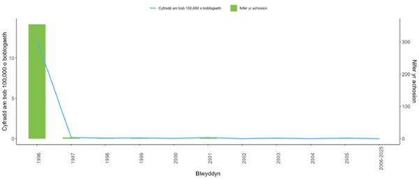 | Blwyddyn | Nifer o achosion | Cyfradd am bob 100,000 o boblogaeth |