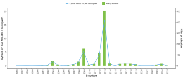 | Blwyddyn | Nifer o achosion | Cyfradd am bob 100,000 o boblogaeth |